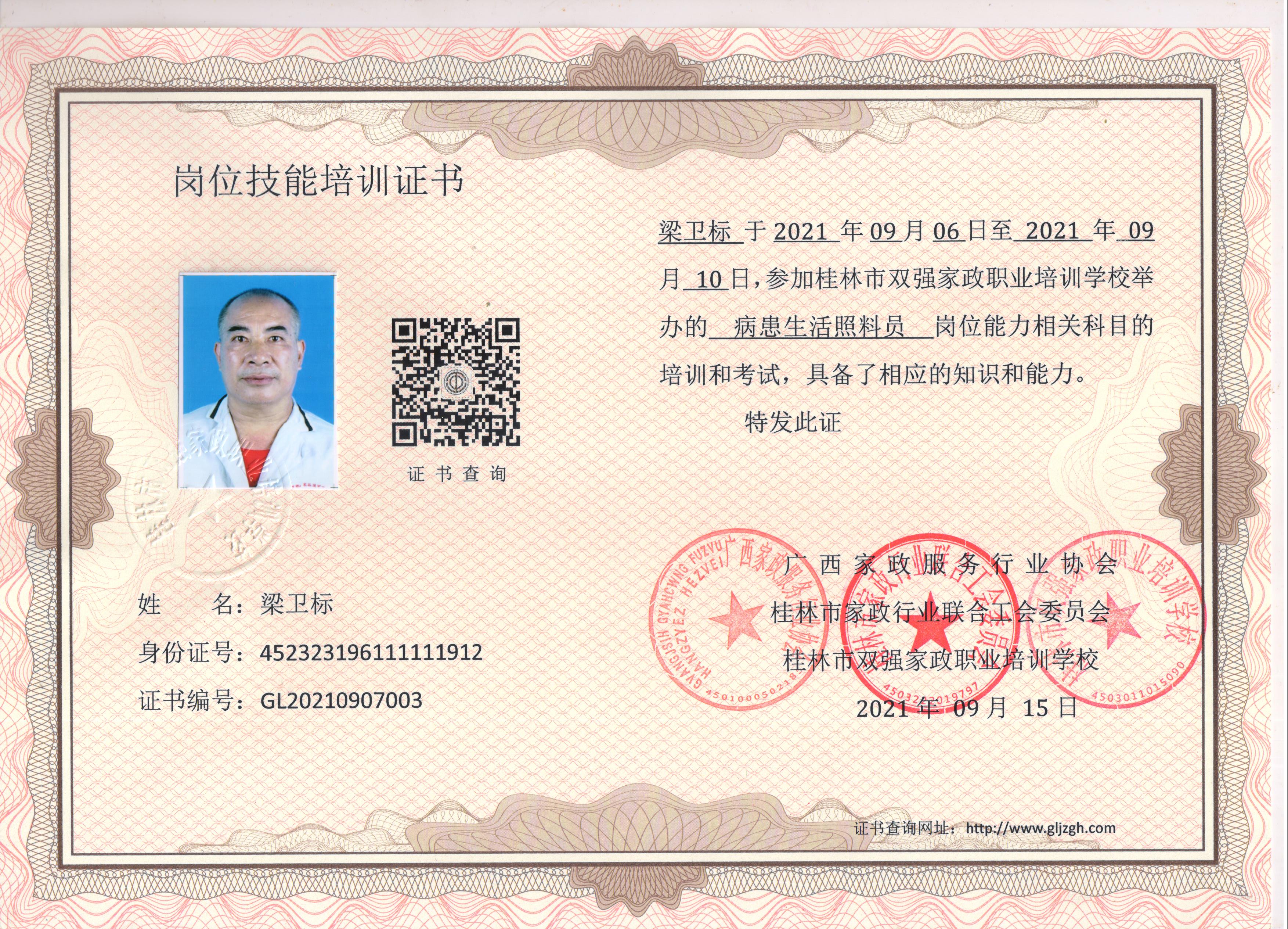 2021年 9月,参加了“广西家政服务行业协会”、“桂林市家政行业联合工会委员会”联合“桂林市双强家政职业培训学校”举办的病患生活照料员培训,并获得了“病患生活照料员”行业证书;
