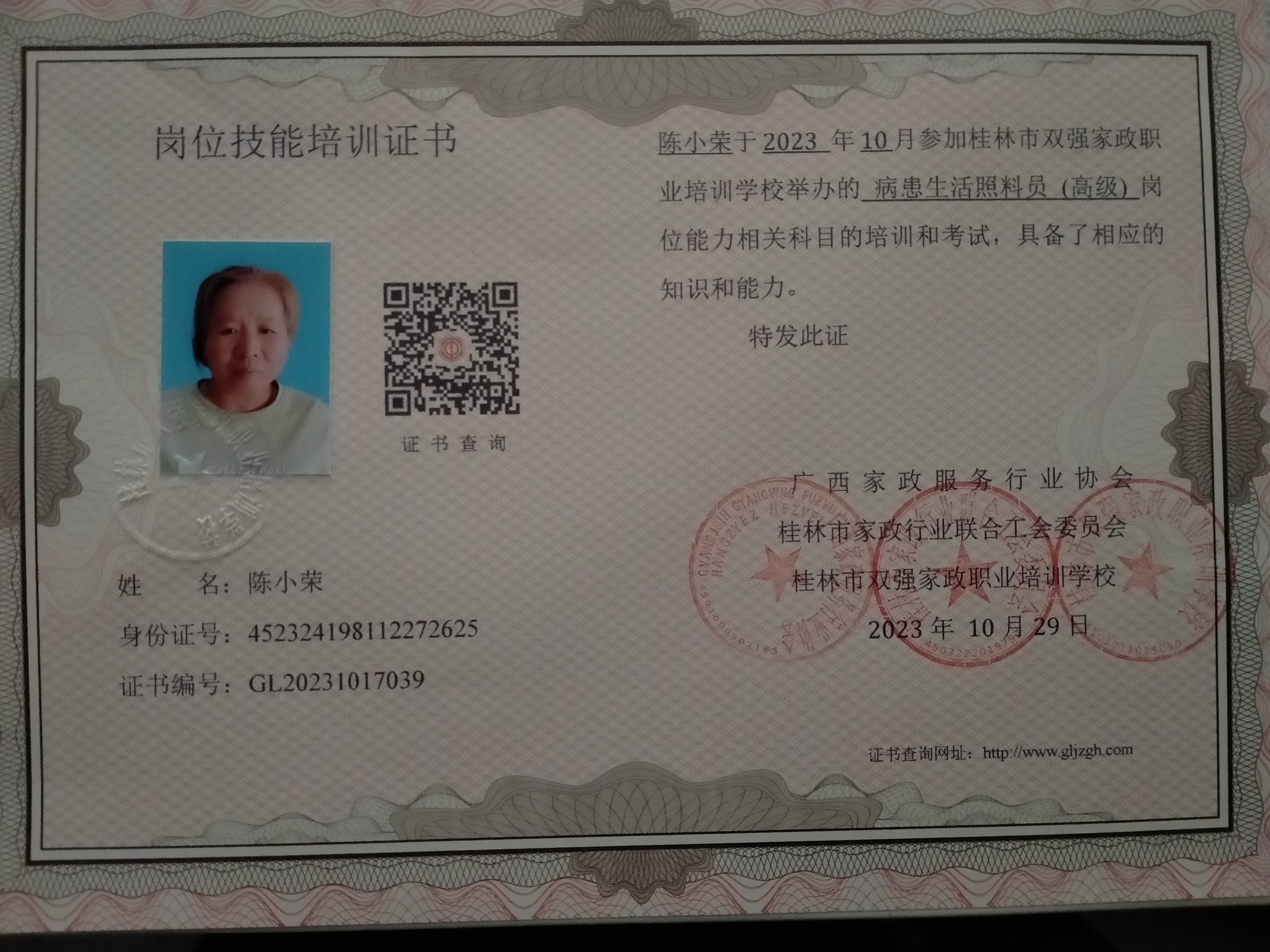 一、高级病患生活照料员证书