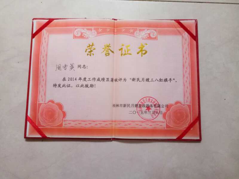 周雪英同志:在2014年度工作成绩显著被评为“新民三八红旗手”,
