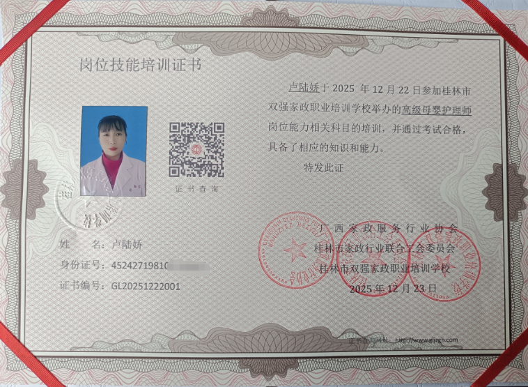 高级母婴护理师证书