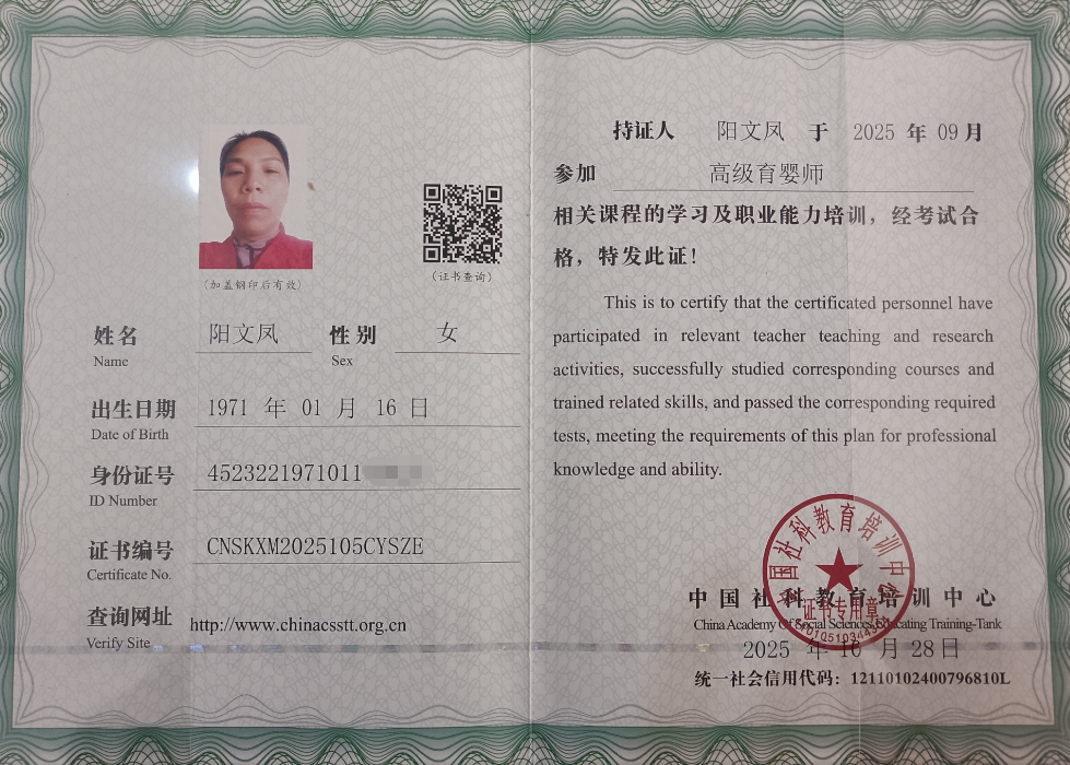 证件:中级育婴师