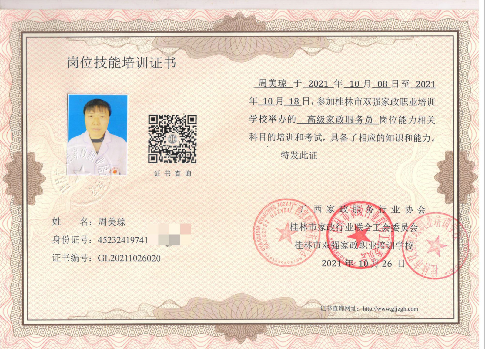 4.2021年10月,参加了“广西家政服务行业协会”、“桂林市家政行业联合工会委员会”联合“桂林市双强家政职业培训学校”举办的高级家政服务员培训,并获得了“高级家政服务员”行业证书;