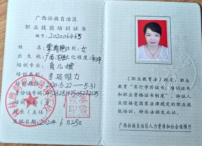 工作经历:2018年2月~2023年5月,在临桂金汇花园,育婴员带大大宝,又带大二宝上幼儿园。