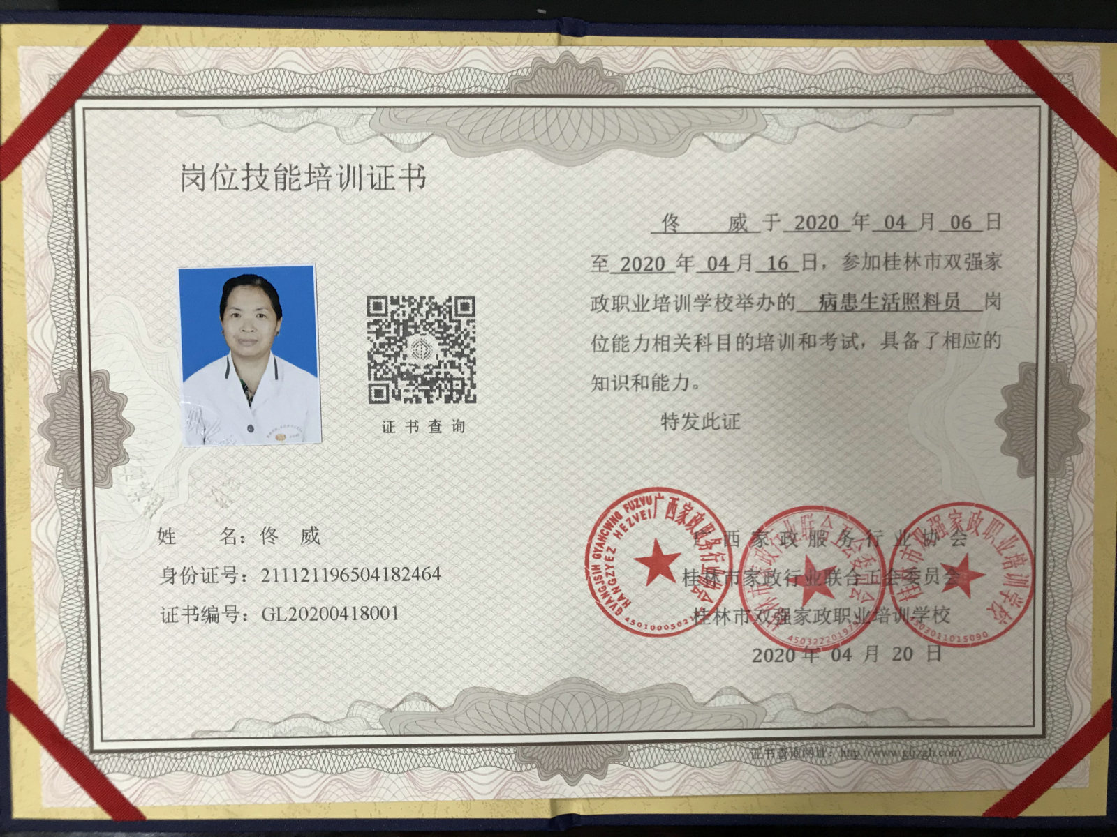 1、2020年4月,参加了“广西家政服务行业协会”、“桂林市家政行业联合工会委员会”联合“桂林市双强家政职业培训学校”举办的病患生活照料员培训,并获得了“病患生活照料员”行业证书;