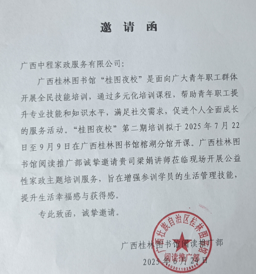 3.2025年8月被广西桂林图书馆“桂图夜校”2025年7月22日-9月9日邀请开展公益性家政主题整理收纳系列8节课的培训讲师服务