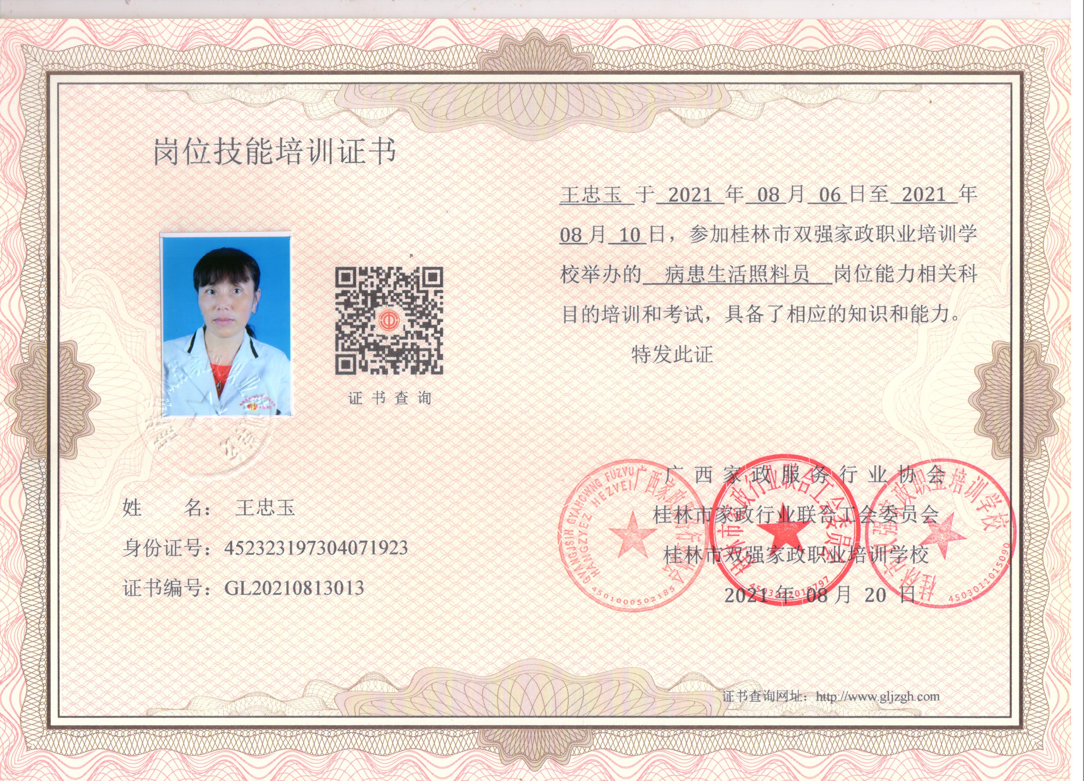 1.2021年 8月,参加了“广西家政服务行业协会”、“桂林市家政行业联合工会委员会”联合“桂林市双强家政职业培训学校”举办的病患生活照料员培训,并获得了“病患生活照料员”行业证书;