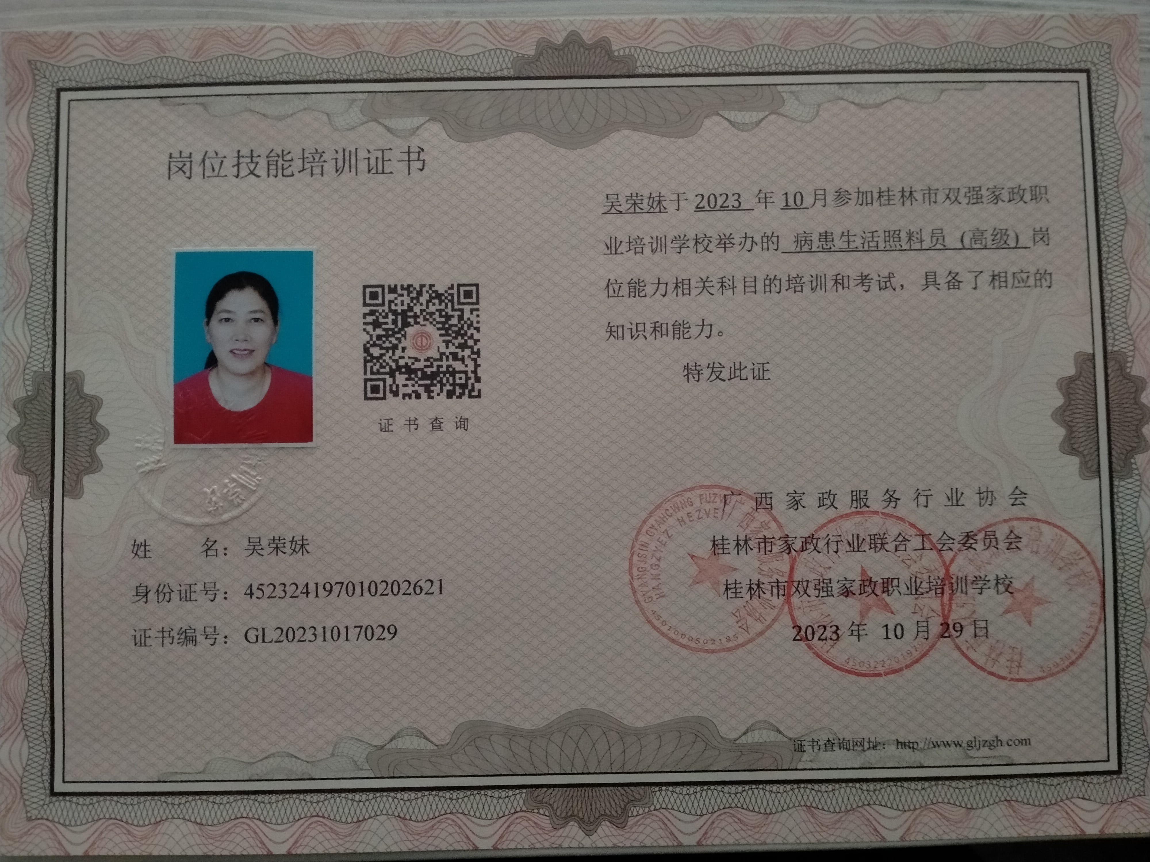 一、高级病患生活照料员证书