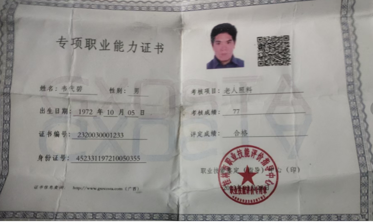 老人照料证书