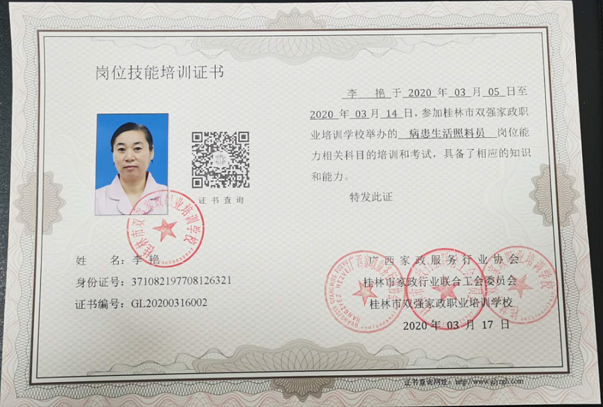 1、2020年3月,参加了“广西家政服务行业协会”、“桂林市家政行业联合工会委员会”联合“桂林市双强家政职业培训学校”举办的病患生活照料员培训,并获得了“病患生活照料员”行业证书;